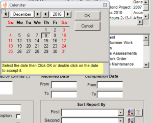 Our techs listen to the issue and make a few suggestions and if that doesn’t work, everybody gets on TeamConnect. This allows our customers to have a tech fix their issue remotely, and is quite handy. And really a step up from ‘make sure your computer is running TeamWORKS’ or ‘can you exit TeamWORKS and log in again?’. TeamConnect allows the customer to give TeamWORKS techs control so they can troubleshoot more easily. Work orders and all that go with them (PM’s, event scheduler, fuel tracker, inventory and all the rest) frequently use a calendar option. No surprise there – you have to know when the work is needed. But it’s so much easier to choose a date instead of typing the date in.